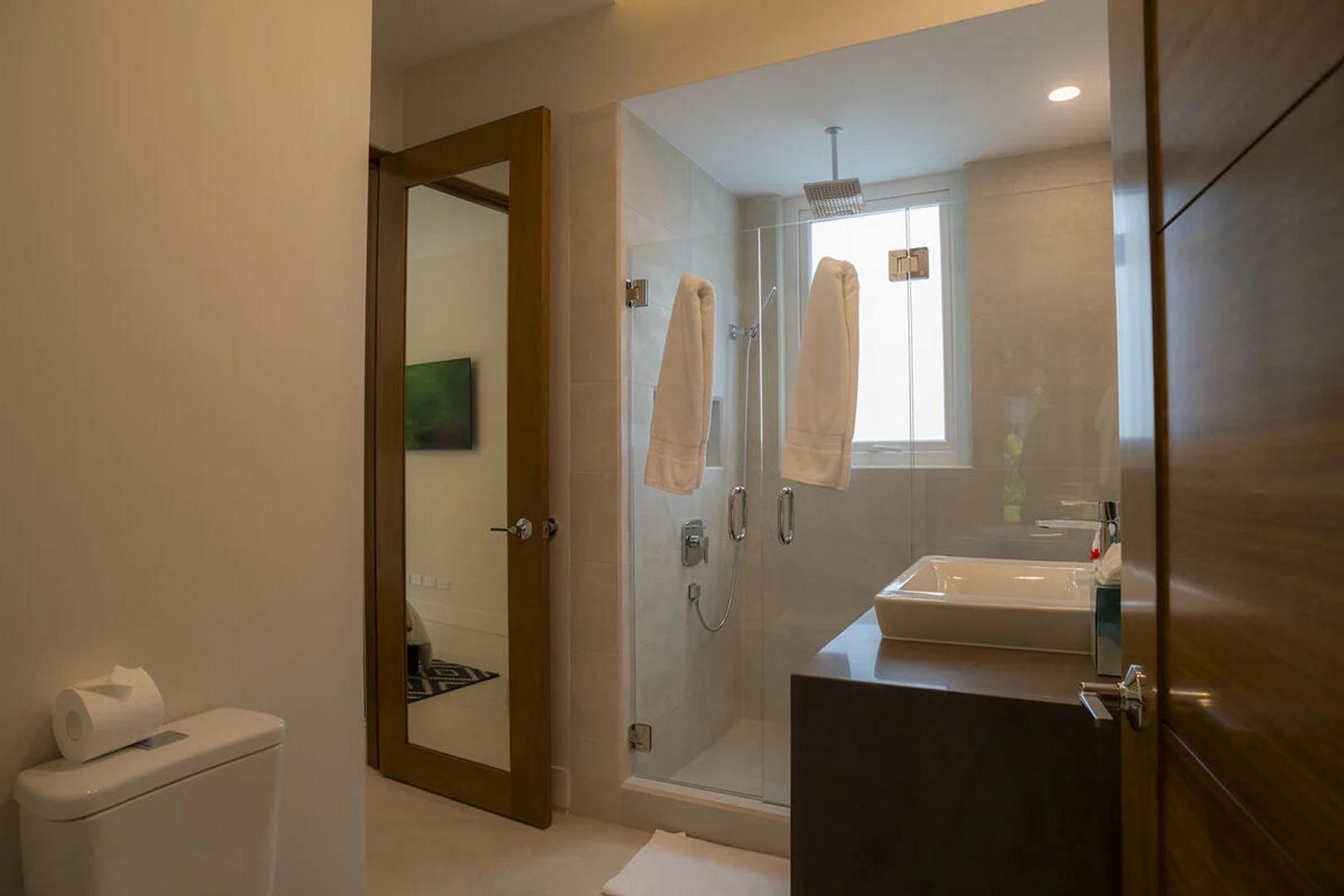 Inside feels bright and relaxed. Big windows let in the sun. Nothing cramped, nothing stuffy. There’s a full kitchen if you want to cook—or we can get a private chef to handle it all for you. The living room’s got comfy sofas… good for lounging, reading, or just doing nothing. The big glass doors slide open wide, and suddenly you’re outside. Pool’s right there. Jacuzzi, too—kind of hidden in the greenery. It all flows together really well. Some days you might not even feel like leaving. Swim, snack, nap… go with the flow.