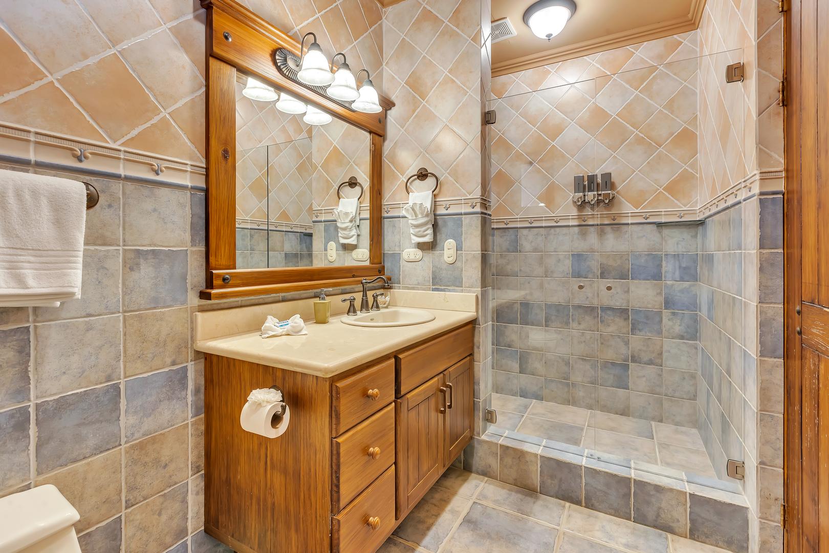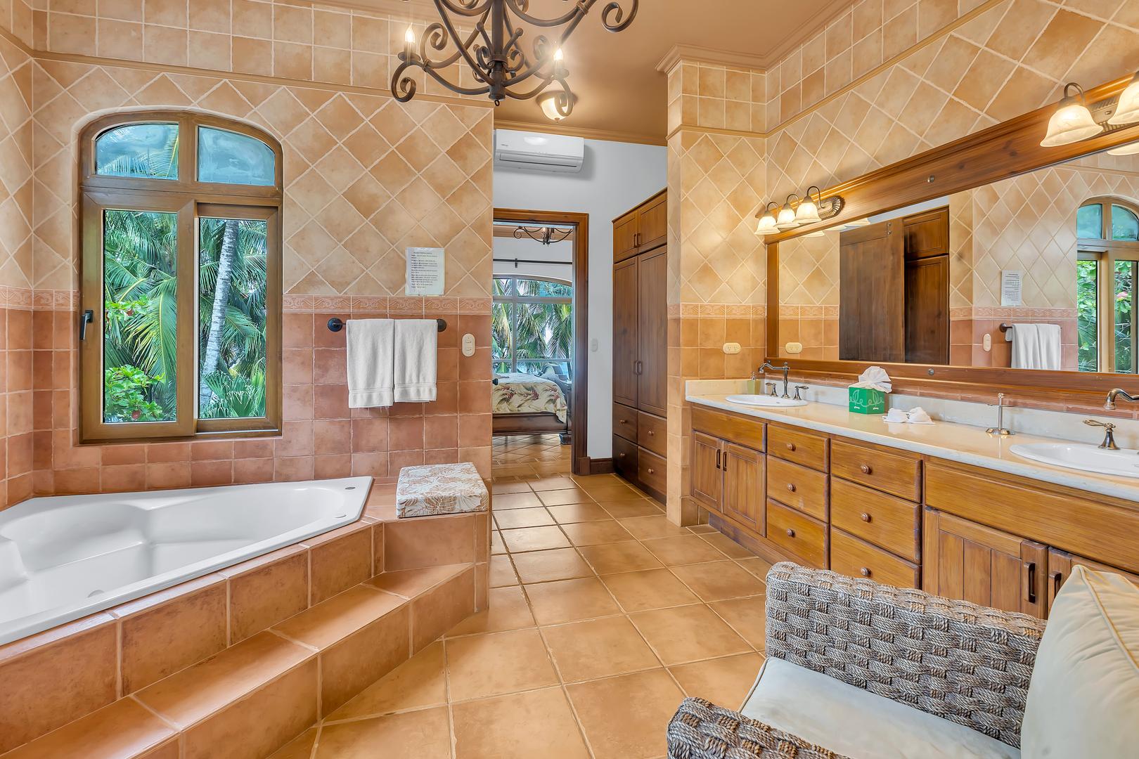 Inside, you’ll find warm, carved-wood furnishings and a soothing, contemporary ambiance. The entertainment room offers satellite TV and surround sound for cozy evenings indoors. Stay connected with Wi-Fi, a computer station, and all the modern comforts you’d expect from a world-class vacation villa.