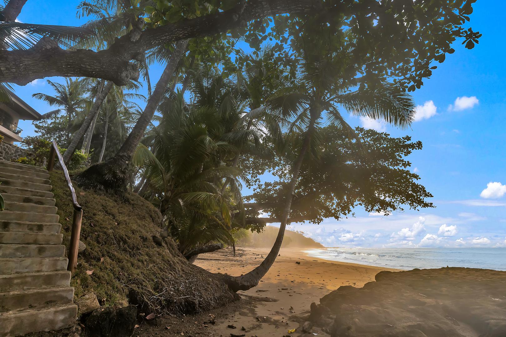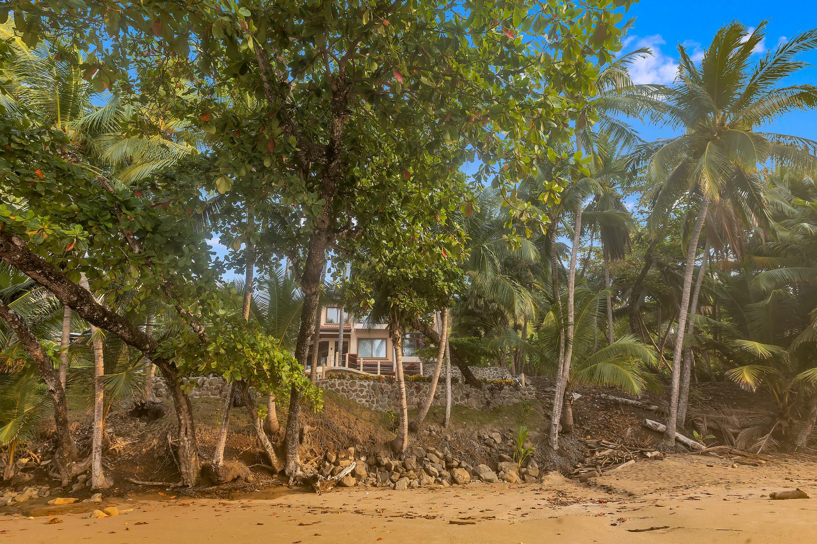 The villa sits right on the beach, with easy access to a long, quiet stretch of sand and beautiful palm-lined views.